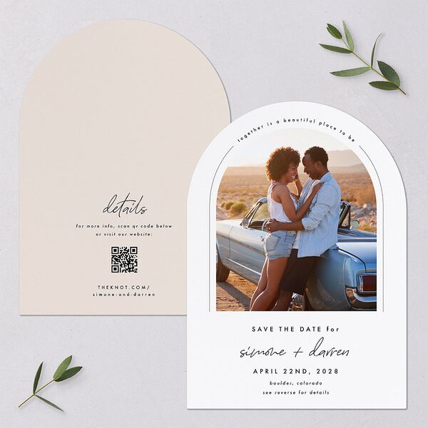 Give your guests a creative preview of your big day. These save-the-date cards will showcase your favorite couple's photo on the front, with its arched shape detailed with a bridge of loving words overhead. Your wedding date and venue location appear beneath your photo in sans-serif, while your names take center stage in a handwritten-style script.