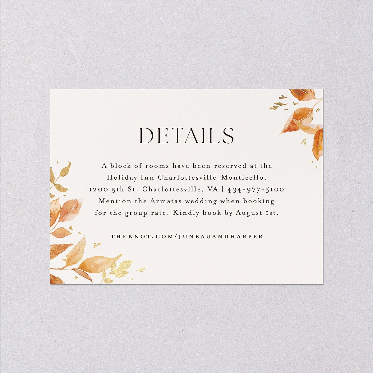 An elevated look with an autumnal twist. Your wedding enclosure card displays your event's details in delicate typography, with inky leaves accented by foil in the bottom left and upper right corners. The understatement and balance feels both luxurious and crisp, like a fall day.