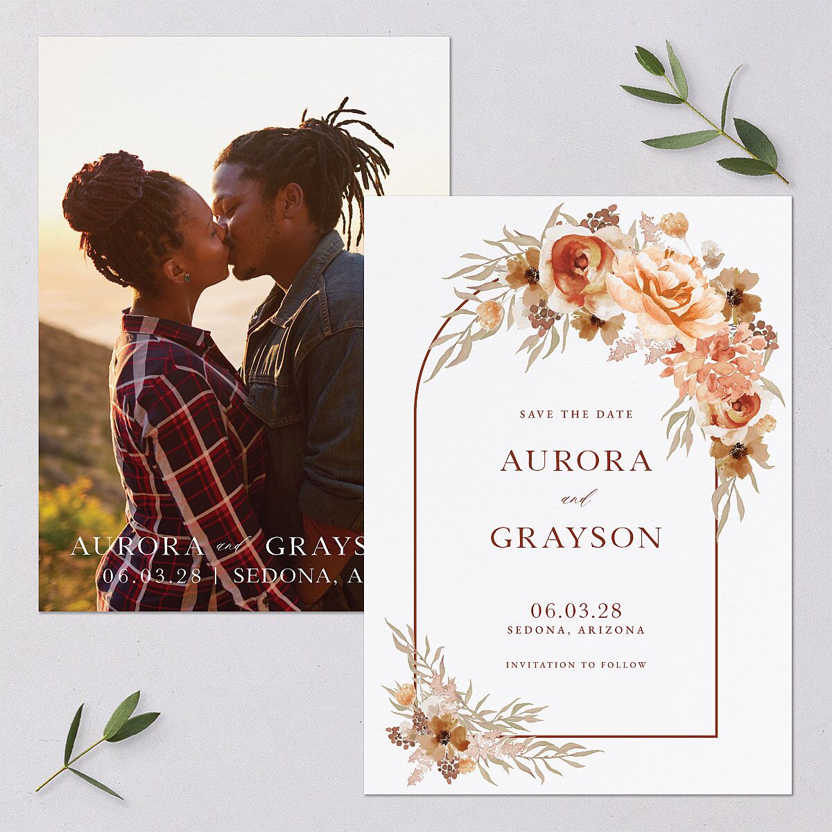 This southwestern-inspired save the date card is the perfect way to alert your friends and family of your upcoming special day. Peach and earth-toned florals surround an arch, which perfectly frames your wedding details. Use the reverse of this card to feature your favorite couple photo!