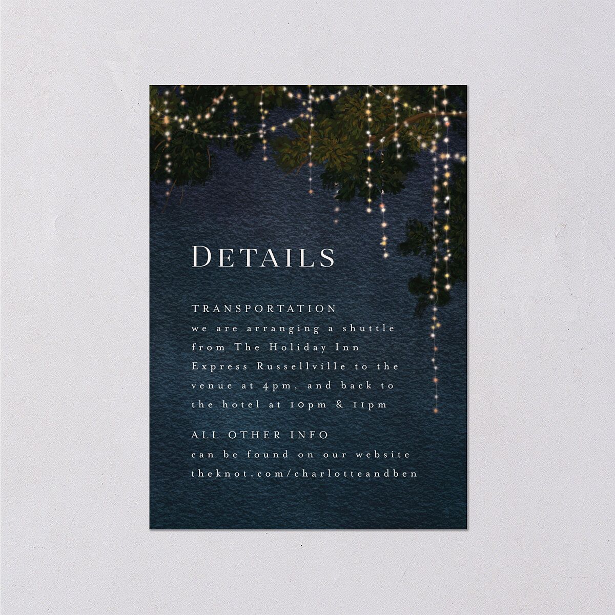 These wedding enclosure cards display your day-of details in a rustic serif typography against a textured, night-sky-inspired backdrop. Painted branches and enchanting string lights hang overhead, adding a warm evening glow to your stationery.
