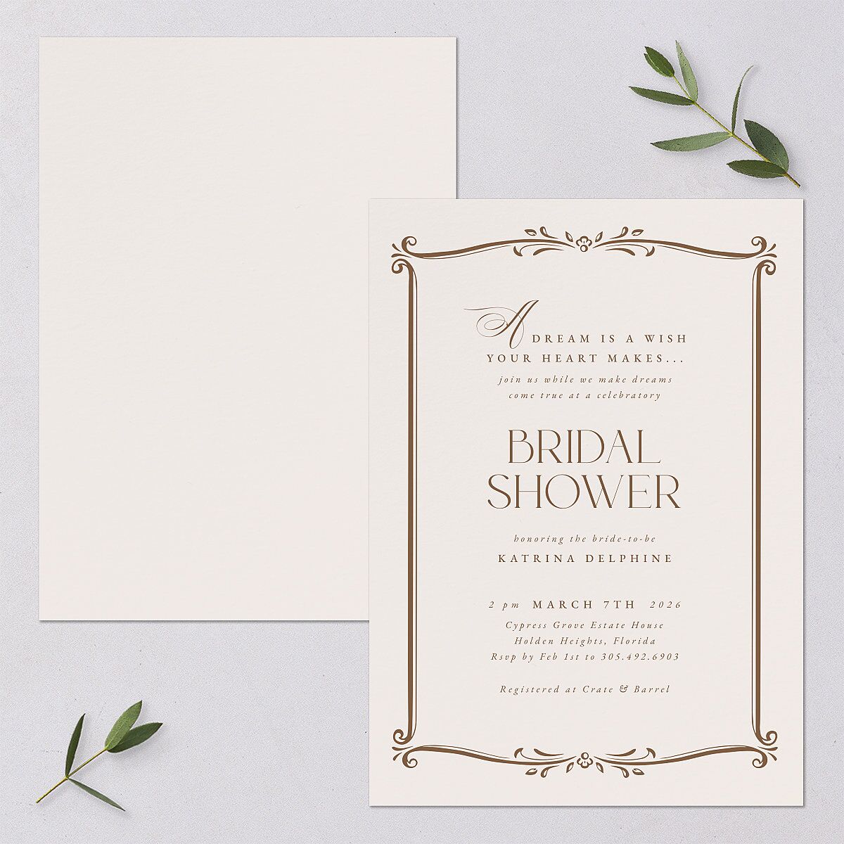 Your bridal shower invitations each show a fairytale frame design. Within this are your invitation message, names, and event details.
