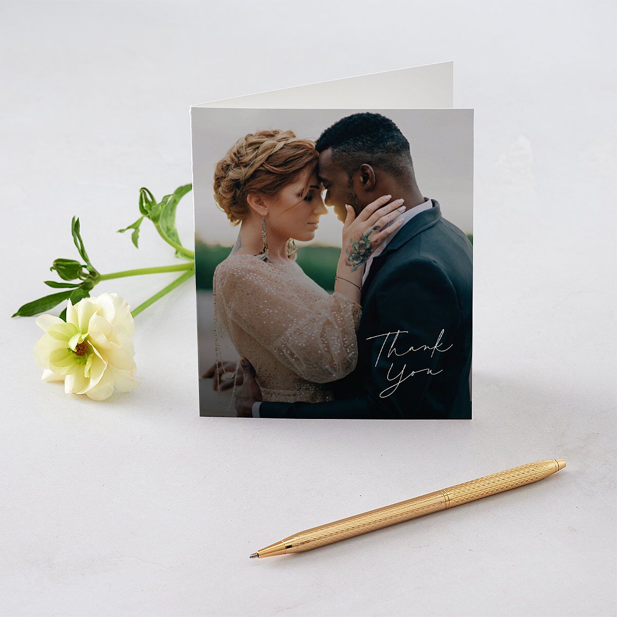 Let your loved ones know just how much you appreciate them with these charming thank-you cards. These cards display a portrait of you and your partner with swirling, hand-written typography that reads “Thank You” in the corner.