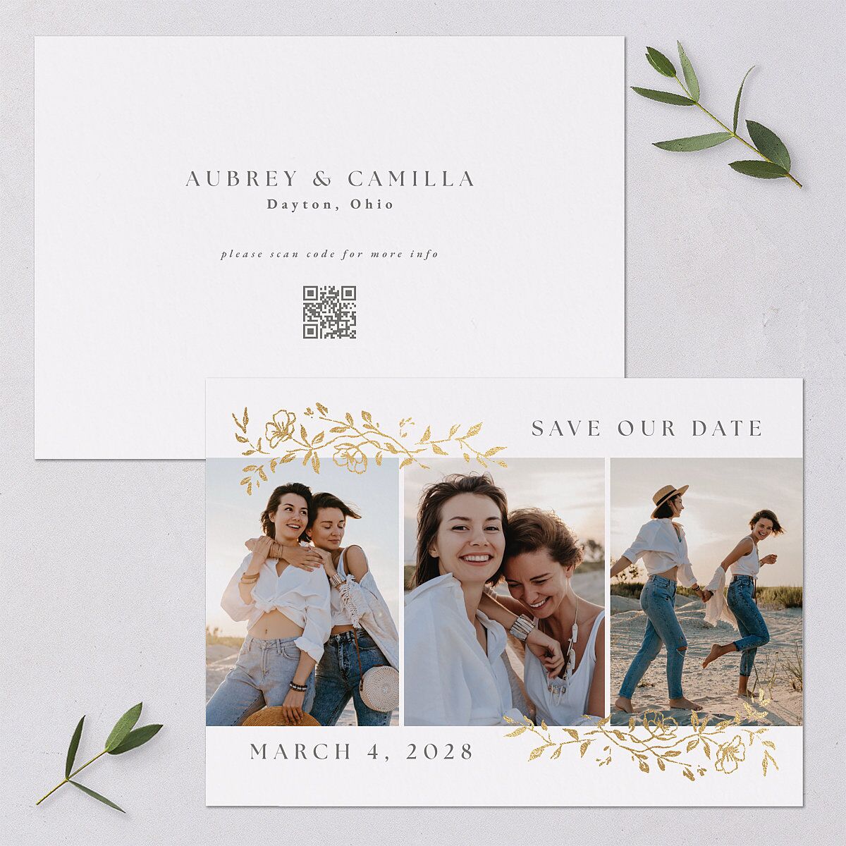Hint at the romantic celebrations to come with your save-the-date cards. The front feature three photos, framed by shimmering foil branches and "save our date" along with the month, day, and year of your celebrations. On the back in elegant typography are your names, the location, and a code to scan for more info.