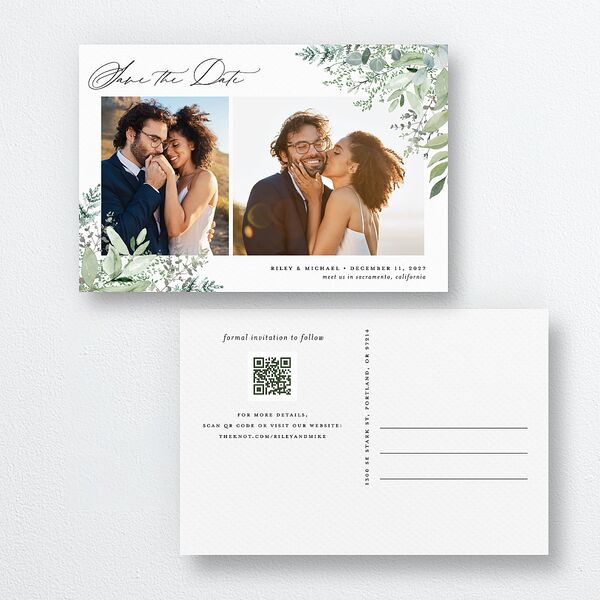 Lush foliage rendered in a delicate painterly style leans inwards from alternating corners on these floral-themed wedding thank you postcards. Set against a paper-textured backdrop, a pair of photographs provides an eye-catching and sentimental centerpiece, while your details appear in a mix of swirling script and timeless serif fonts. The reverse makes space for a QR code leading to your wedding website, along with a place for a heartfelt message.