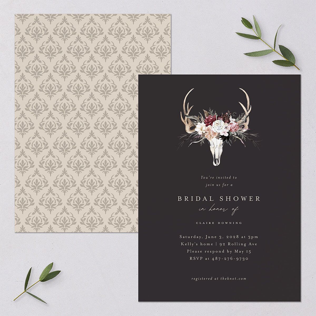 The front of each of these bridal shower invitation cards shows an illustration straight out of a rustic western gothic with antlers and blooms. Below are your words of invitation, name, and event details. The back shows a pattern reminiscent of the wallpaper in a saloon.