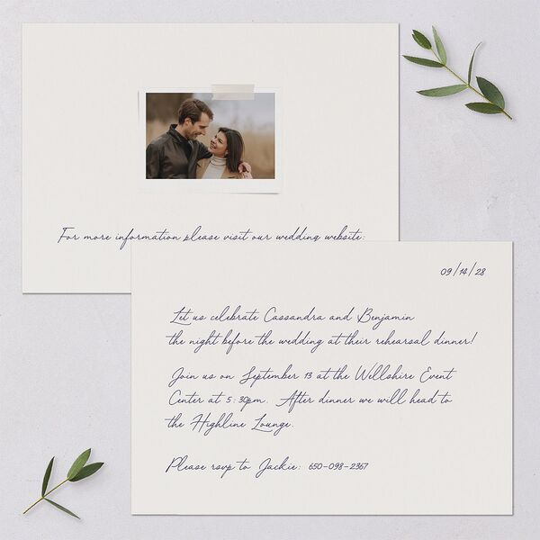 This rehearsal dinner invitation is crafted in the spirit of a longhand letter, featuring elegant cursive lettering that creates a graceful flow throughout the piece. Including a link to your wedding website, it serves as the perfect prelude to your primary celebrations.