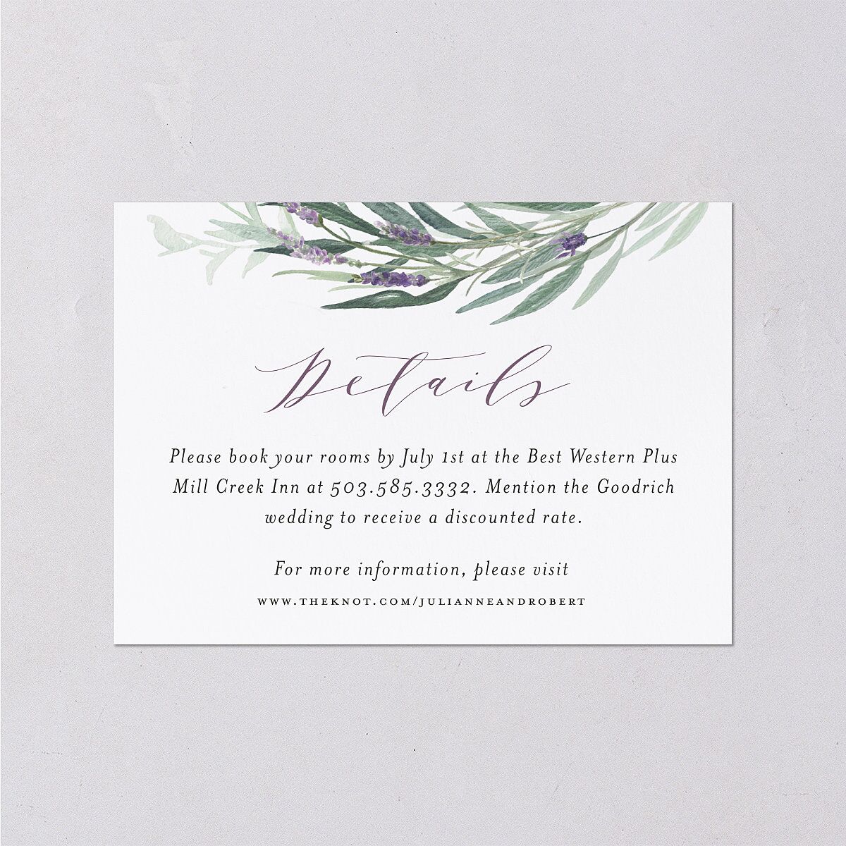 Lavender blooms and sage greenery frame this peaceful and pretty wedding enclosure card. The additional information about your wedding day is displayed in modern calligraphy, which adds to the romantic theme of your invitation suite.