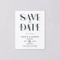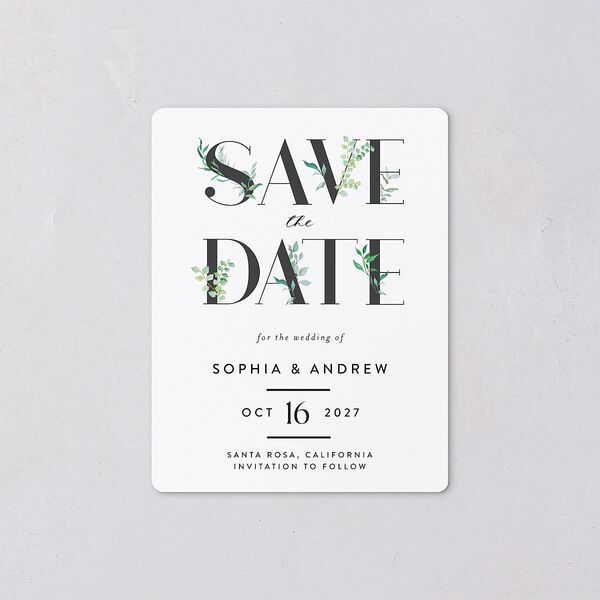 Make an impression with these save the date magnets showcasing a bold design with your main message adorned in leafy illustrations. Your names and event details are featured in sans serif lettering below, with a simple ampersand contributing a sense of elegance and refinement.