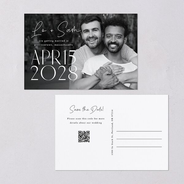 The front of your save-the-date postcards has your selected photo as the backdrop and shows your names, wedding location, and wedding date. The back of your postcards shows the words "Save the Date!", a QR code for more information, and space to write a mailing address.
