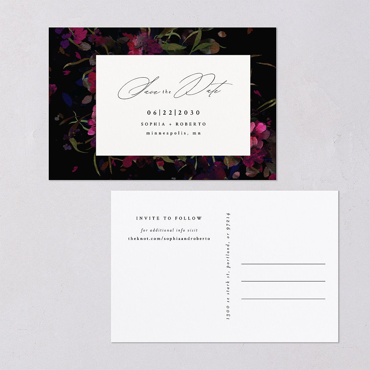 This luxurious postcard displays your name and details in timeless serif, contrasted by a heady backdrop of moody painted flowers. Save the Date expressed in script lends a timeless finish to your card, tying the rich aesthetic together.