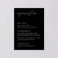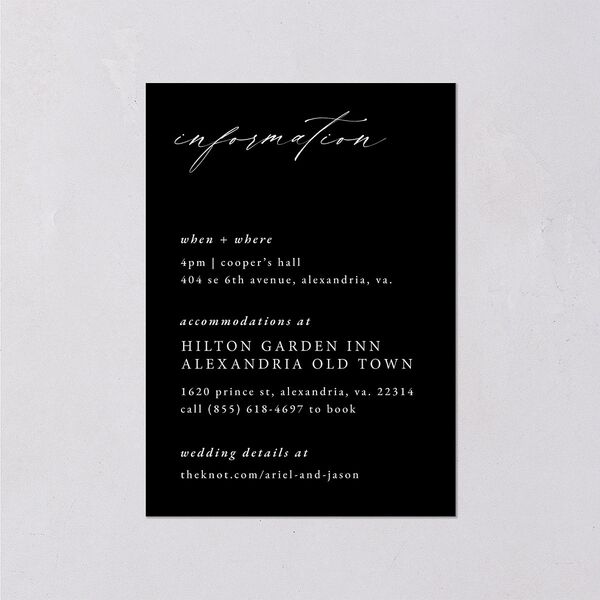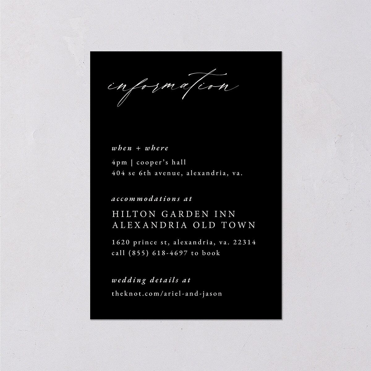 The details of your day appear on these cards in sleek serif and calligraphy font, set against a color block background. The back of these cards show a bold motif of blooming florals.