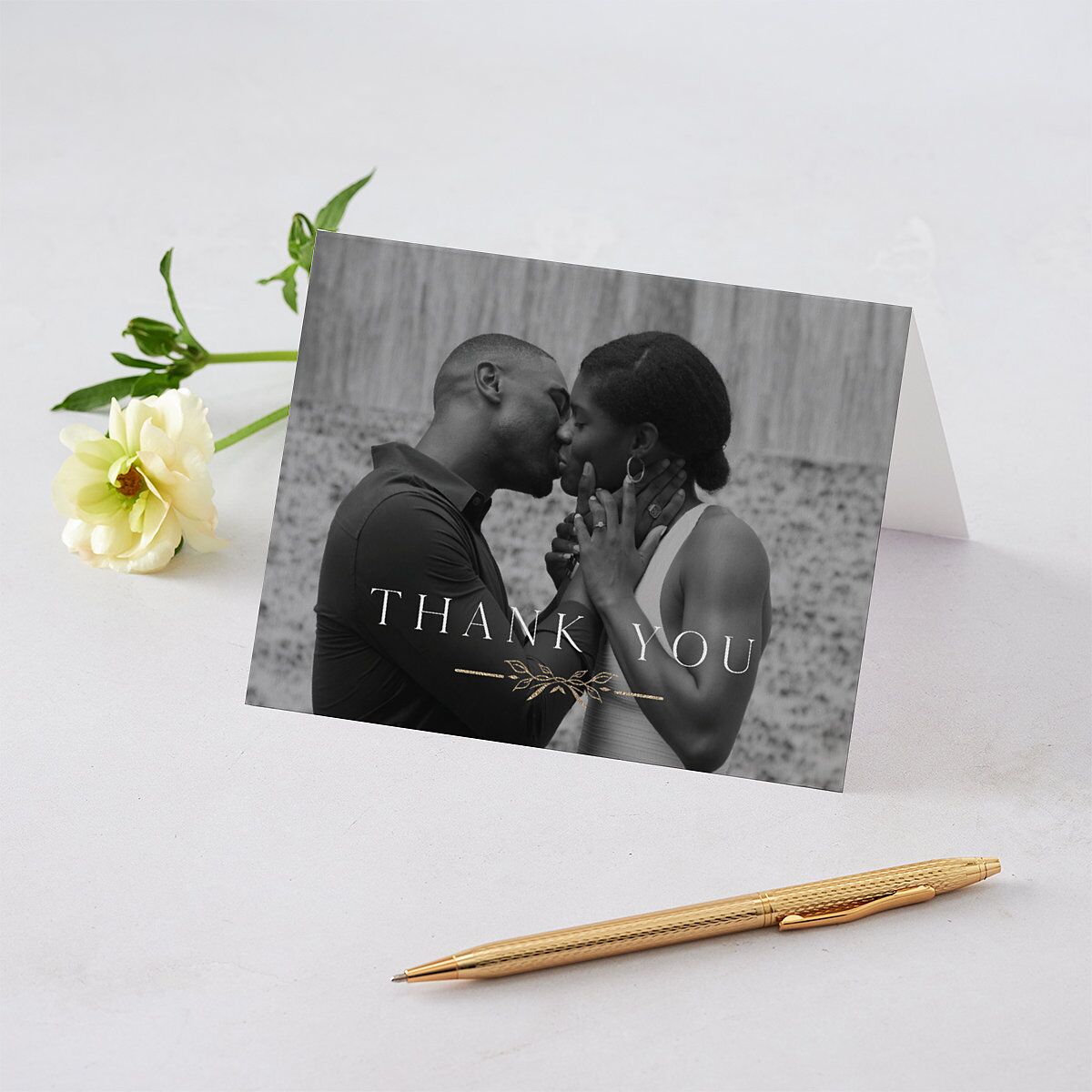 An evocative frame of gilded foils creates the front of your thank-you cards. A message of thanks along with your names appears in the center in bold sans-serif font and the card is blank inside for your custom message.