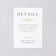Apprise your guests of the details of your celebration with your minimalist yet subtly opulent wedding enclosure cards. They are adorned with a shimmering foil detail of leaves and a classic serif font.