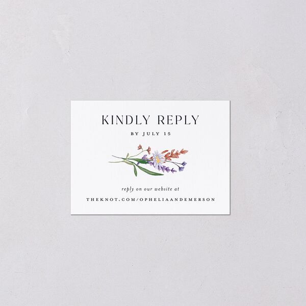 A vibrant wildflower motif brings a touch of Mother Nature to these RSVP cards. At the top of each card, a gentle reminder to reserve a spot is highlighted in an uppercase, slim serif font, followed by a link to your wedding website.