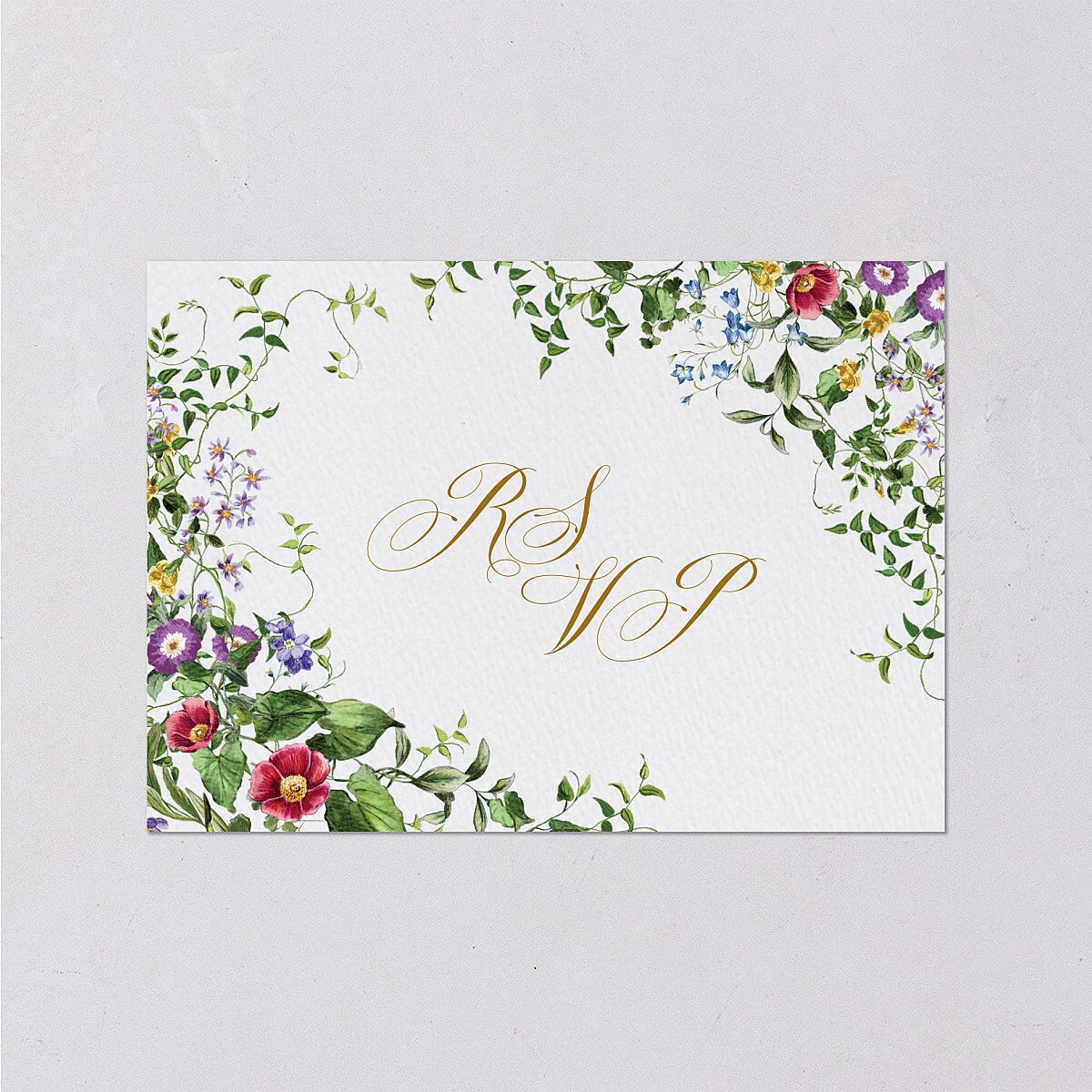 Your opulent wedding response cards are framed by beautiful garden florals and greenery, with the letters "RSVP" displayed in romantic calligraphy. On the back, your RSVP request appears in formal serif font and elegant italics.