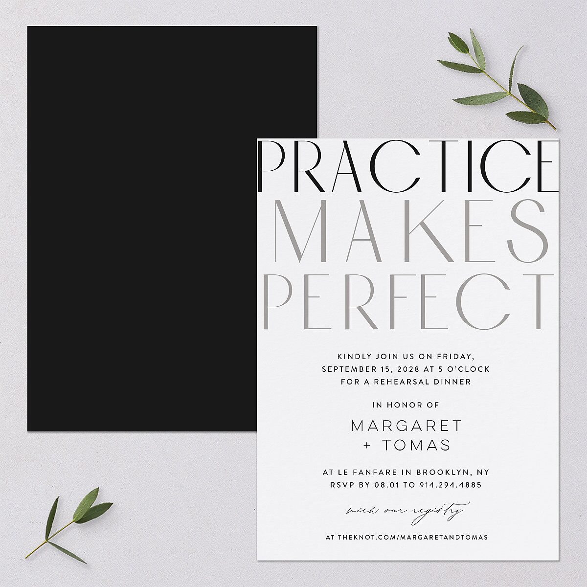 These rehearsal dinner invitations reassure you that, “practice makes perfect” in a title that features chic and vibrant sans-serif font. The details of your gathering follow in a combination of sans-serif and script type. The back of the cards shows a color block print.