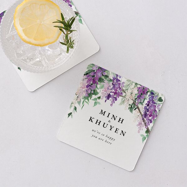These nature-themed wedding coasters beautifully reflect the blooming essence of your love. With every sip, guests will be warmly reminded of your gratitude for their presence, expressed through a heartfelt message in a classic serif font. Displayed beneath a lush wisteria design and your custom monogram, this elegant detail adds a timeless touch to your celebration.
