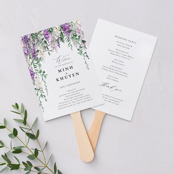 These fan programs illustrate your celebratory details under a blooming cascade of watercolor wisteria florals. These are more than just programs; they are keepsakes, a timeless reminder of a love story that, like the wisteria, will continue to bloom year after year.