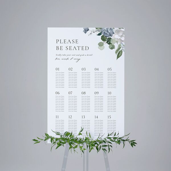 Gently guide your loved ones to their assigned table with this seating chart. Warm and inviting in design, the chart is adorned with a lush floral arrangement in delicate watercolor. The arrangement leads the eye down to the details below in an eclectic mix of cursive and serif typefaces. Guests can easily find their seats under neatly organized numerical columns.