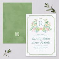 Let your guests know they can find you where the waves are with these tropical-inspired wedding invitations. A watercolor burst of palm tree foliage and lush florals fan out from a monogram crest. Below, your names are rendered in an artful cursive typeface, followed by neat lettering, all housed in a ticket-style border. Flip the invite to reveal a QR code nestled at the base of a watercolor backdrop, guiding loved ones to your wedding website.