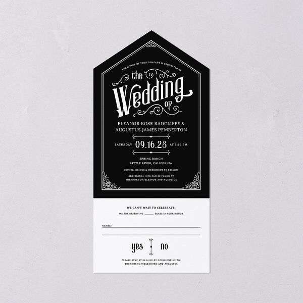 This all-in-one invitation seamlessly blends Gothic and Western styles, creating a dramatic way to announce your big day. A frame surrounds the details of your day, which are presented in a serif font, with small flourishes elevating the design.